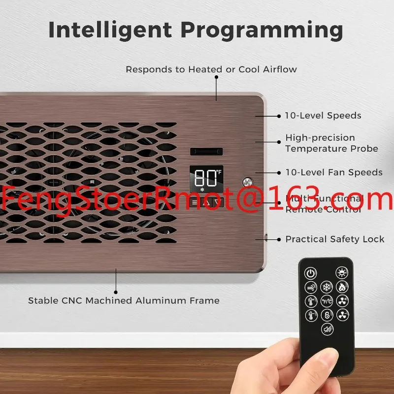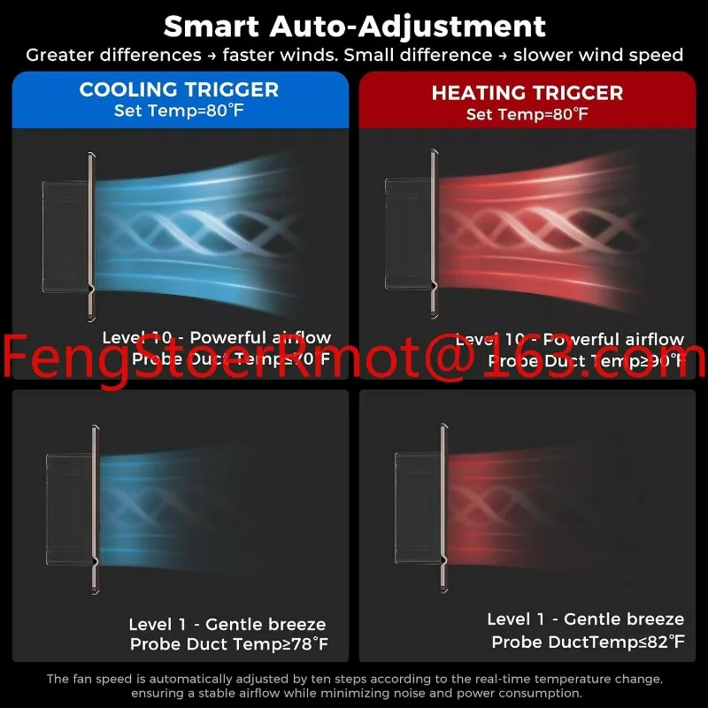 The fan typically has an adjustable thermostat or a sensor that automatically turns on when it detects warm or cool air coming from the vent, and it shuts off when the system turns off.