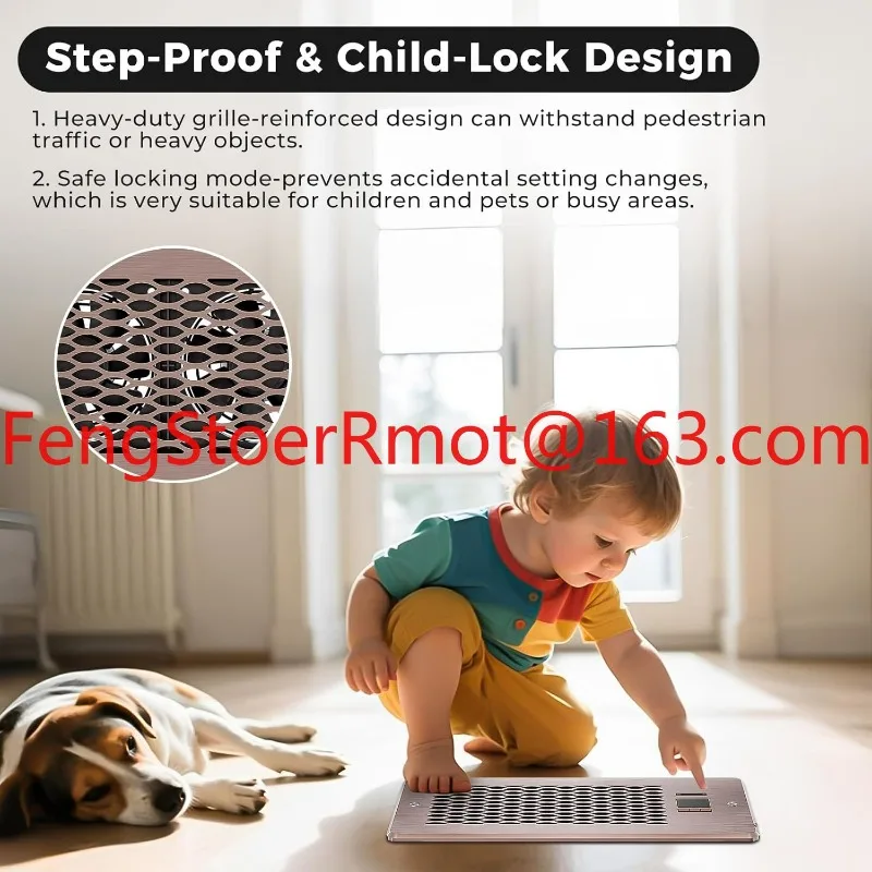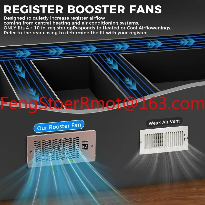 This product is an air booster fan that's designed to be installed directly into your existing floor, wall, or ceiling vent. It fits a standard 4-inch by 10-inch duct opening.